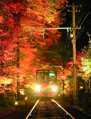 車窓から眺めるもみじトンネル列車。美しいもみじのライトアップを