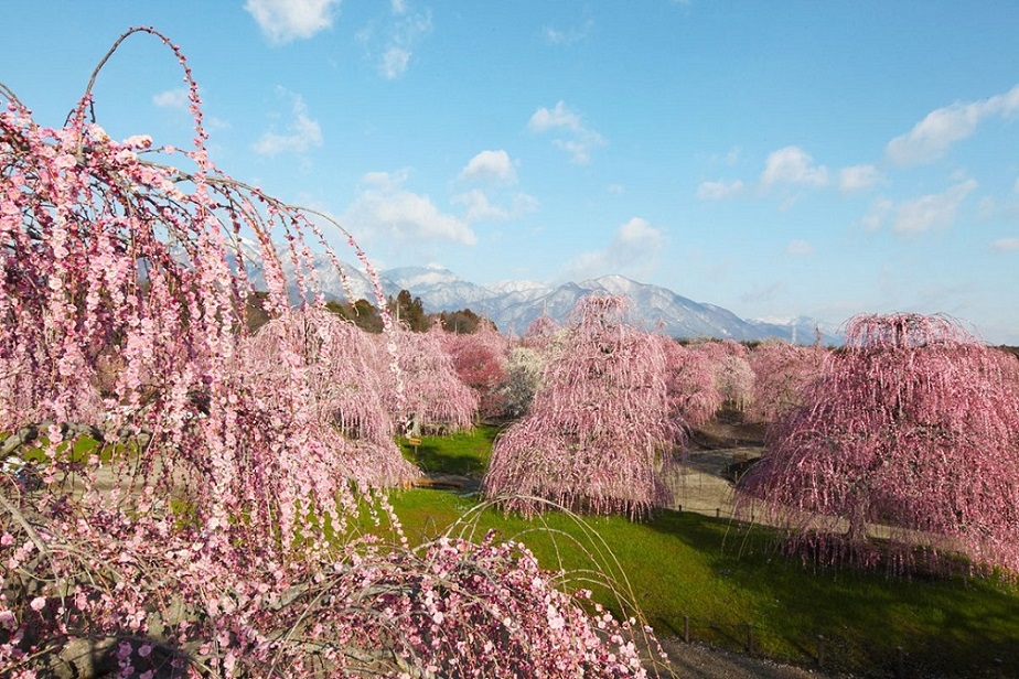 三重県の鈴鹿の森庭園では、名木「呉服枝垂(くれはしだれ)」を中心とする紅色の枝垂れ梅約200本を観賞。滋賀県の寿長生の郷(すないのさと)では城州白梅を楽しみます。